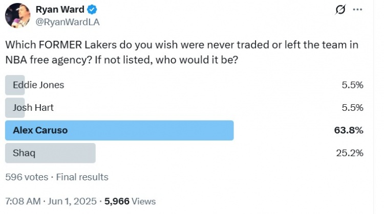 篮球直播6月2日讯 今日,湖人记者Ryan Ward更推,发布了一个调查。 他配文写道:“在NBA自由市场中,你希望哪些湖人旧将从未被交易或离队?若名单未列出,你心中的人选会是谁?” 最终,卡鲁索以63.8%的比率胜出,大鲨鱼第二,哈特和埃迪-琼斯排名第三。