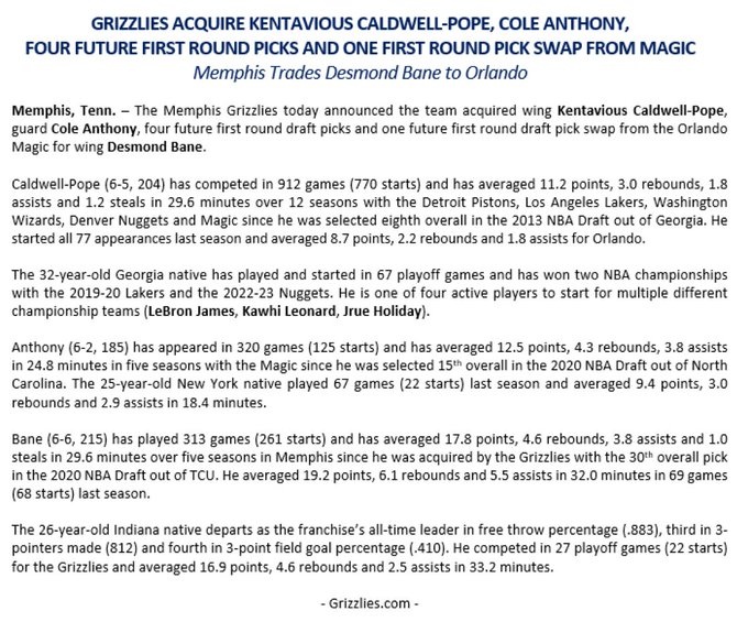 篮球直播6月16日讯 今日灰熊与魔术达成交易,他们送出贝恩,从魔术获得波普、科尔-安东尼、四个未来首轮签和一个首轮签互换权。 美记Brett Siegel发文写道:“灰熊队的官方交易声明中没有向贝恩发表任何祝词或感谢(只是罗列了几人的数据和成绩),消息人士称,贝恩今天对这笔交易感到意外。他在今天之前并不知道自己将会被交易。” “消息人士称交易谈判相关内容在过去 24 小时内愈演愈烈,贝恩这时才发现自己参与其中。他没想到自己会在休赛期被灰熊交易。”Brett Siegel写道。