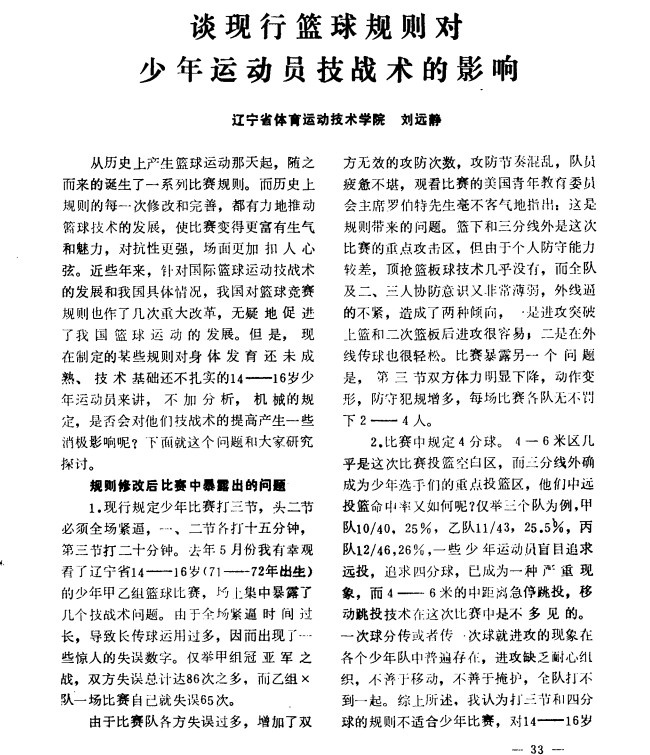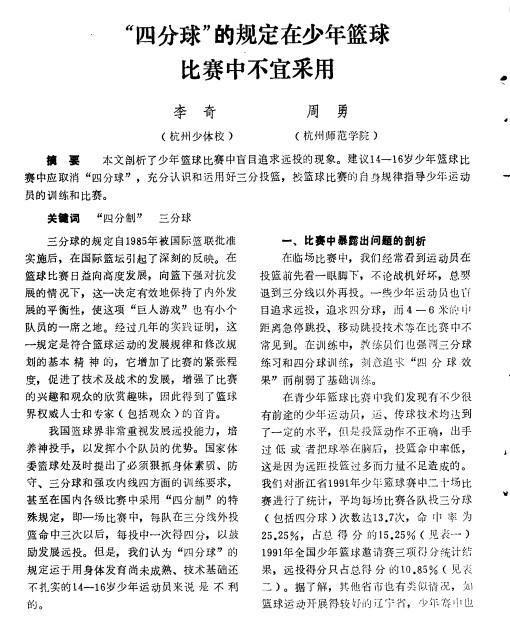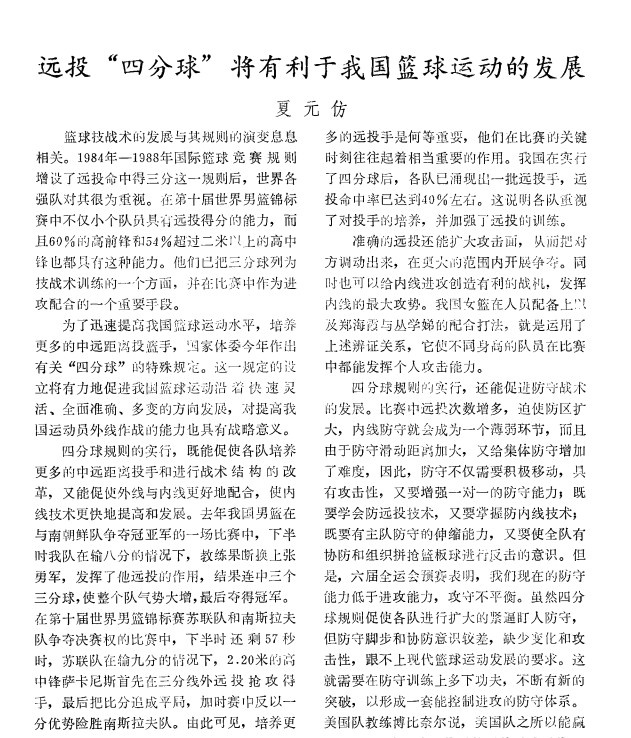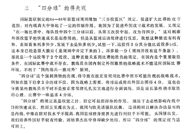 作为80-90年代知名的三分手,张勇军曾在汉城亚运会上连进4个三分,帮助中国队反败为胜,也曾在汉城奥运会上,场均砍下20分排名得分榜第四。而如果他在网络上看到四分球的画面,说不定也会微微一笑,然后怀念起当年在国内赛场上疯狂出手“四分球”的时代。 1980年代,哈林篮球队掀起的风暴席卷全球,NBA率先改动规则,FIBA也随之而动,1984年,三分线划满了世界。中国篮球圈不但从善如流,而且举一反三,开发出了新的规则:在三分线外投中4次后,从第5次开始,投中一次算四分。 严格来说,中国联赛的四分球并不是距篮筐35英尺的超远投篮,而是在三分线上出手算四分。在那个篮球比赛还没职业化、市场化的时代,国家体委用修改规则来鼓励发展某项技术做法,更偏向“专业体育”的范畴(在CBA成立后,这种习惯还是会偶尔出现,例如2002-03赛季的CBA新增规定:各队每场比赛中必须选择其中一节采用全场紧逼防守。这一规定源自02年男篮在世锦赛与亚运会上的失利,虽然在意见征集阶段就收到了包括李秋平在内的诸多反对声,但篮管中心还是坚持了下来)。 1987年国内体育科研期刊中关于四分球的研究 在四分球规则的引导下,全国青年和成年篮球队纷纷化身“远射大队”,而远射打铁带来的长篮板又掀起了转换进攻的浪潮。在第二届篮协杯男子篮球赛中,成年队场均发动快攻19次,利用快攻得到30分,占了全场得分的将近三分之一。另外三分之一则来自三分线外的出手,全国队伍的三分命中率达到了36.5%,其中辽宁队更是突破了42%大关。济南部队的张鹏单场比赛射落68分,就连青年队也在部分场次投出了65%的命中率。 在快攻和三分的火力急袭之下,比赛节奏和攻防强度也随之改变,球员们更频繁地杀入篮下,辽宁队当时场均拿下112分(这还是场均40分钟的比赛),其中得分最高的一场砍了154分。但三分能力的强化增加了防守难度,比赛节奏的加快也增加了球员的运动量,大部分球员在比赛后半段疲态显著,场均失误自然水涨船高。 大量的三分和转换,篮下与外线进攻的结合,迅速提升的比赛节奏,被三分手扩大的防守面积…..像不像当代NBA的小球画风? 这是youtube上1996年中国队vs美国队比赛下网友的评论:中国队的打法和如今的NBA球队一样 当时中国篮球圈还提出了这种画风背后的隐忧:“四分篮引起的防区扩大,给协防增加了很大困难,对个人防守能力提出了更高要求,如何加强防守协作性的问题有待解决。同时还急需适应对抗强度,合理运用身体接触与合法用手。” 最终,篮协在全国男篮联赛正式举办时取消了这个规则,但在其他一些地方,四分球的规则被中国篮协一直保留到了新世纪之后,甚至2002年开启的女篮联赛里依然在沿用这个规则(和第一节必须全场紧逼的规则)。 对任何竞技体育项目来说,再微小的规则改动,都会引发不可预料的蝴蝶效应。追求胜利的参与者们合理利用规则、在规则边缘游走是很正常的事情。就像哈登的双后撤步和Step0规则引发持球突破的变革一样。更不用说直接在三分头上加一分的四分球了。 最直观、也是规则制定者们最想看到的变化,就是国内大批三分手的涌现,各支专业队的三分命中率普遍上升到了40%。国内篮球快节奏、重三分的打法,也符合当时“小快灵”的篮球指导原则。更何况精准的远射还能拉扯对手的防线,给内线进攻创造良机,红极一时的女篮组合郑海霞与丛学娣就是最佳模板。 进攻的变化倒逼防守的升级,各队在享用四分红利的同时,也不得不面对防区扩大、协防压力增加的困扰。攻强于守,成了当时各队的普遍现象。 从某种角度来说,三分球和四分球规则,是普通人对内线巨人的一次挑战,让更多身高较矮的外线球员也拥有影响比赛的能力。这也是当时国内发起“小快灵”球风、对抗其他国家高大内线的主因。 但四分球还引来了意想不到的另一面:球员和教练们为了拿更多分,开始功利性地追求四分球,不仅在训练中强化远射,还在比赛中为了投四分而投四分,甚至出现了杀入空篮不出手、强行分到外线的画面。这无疑颠覆了基础的篮球理念,而且——国际比赛可没有四分线这种东西。 1994年北京体育师范学院学报一篇文章中关于四分球的讨论 除了专业联赛,四分球还渗透进了青少年篮球训练之中,14-16岁的青少年篮球赛也设立了四分球制度。身体和技术还没成熟的小球员们,也在三分线外架炮投篮,用的还是歪七扭八的投篮姿势。在1991年的浙江少年篮球赛中,各队的三分命中率只有25%,就连篮球基础更扎实的辽宁,小球员们的三分准心也没超过26%。1987年,美国青年教育委员会主席罗伯特在看了辽宁少年篮球赛后,毫不客气地批评道:“这是规则带来的问题。” 规则引发变革,变革重塑比赛。中国的四分球诞生于三分线出现的黎明,为了培养三分手、继续发扬小快灵的球风,可以说是领先时代的“小球客制化规则”。但三分比两分多一分,都足够引发篮球世界的大洗牌,更何况比三分还多一分的四分球呢? 而且所谓的“小快灵”体系也从没有一个明确的定义,五个詹姆斯组成的队伍在塔克当中锋的球队面前就是进击的巨人,而在平均年身高208cm的球队面前,也必须要打“小快灵”。适应规则、看菜下饭,才是篮球最质朴的道理。 四分球带来了打法上的革新,引发了中国版的小球狂潮,每一个专业篮球馆都曾下过瓢泼的三分雨,像张勇军这